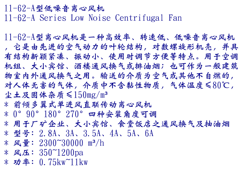 11-62-A式多翼式離心通風機,它是由先進的空氣動力的葉輪結(jié)構(gòu),對數(shù)螺旋形機殼,并具有結(jié)構(gòu)新穎緊湊、振動小、使用時調(diào)節(jié)方便等特點。用于空調(diào)機組、大小賓館、酒樓通風換氣或排油煙;