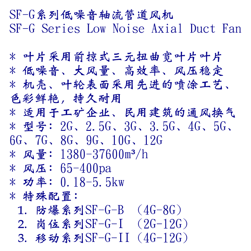 SF-G系列低噪音管道通風(fēng)機(jī),葉片采用前掠式三元扭曲寬葉片葉片,低噪音、大風(fēng)量、高效率、風(fēng)壓穩(wěn)定,機(jī)殼、葉輪表面采用先進(jìn)的噴涂工藝、色彩鮮艷,持久耐用,適用于工礦企業(yè)、民用建